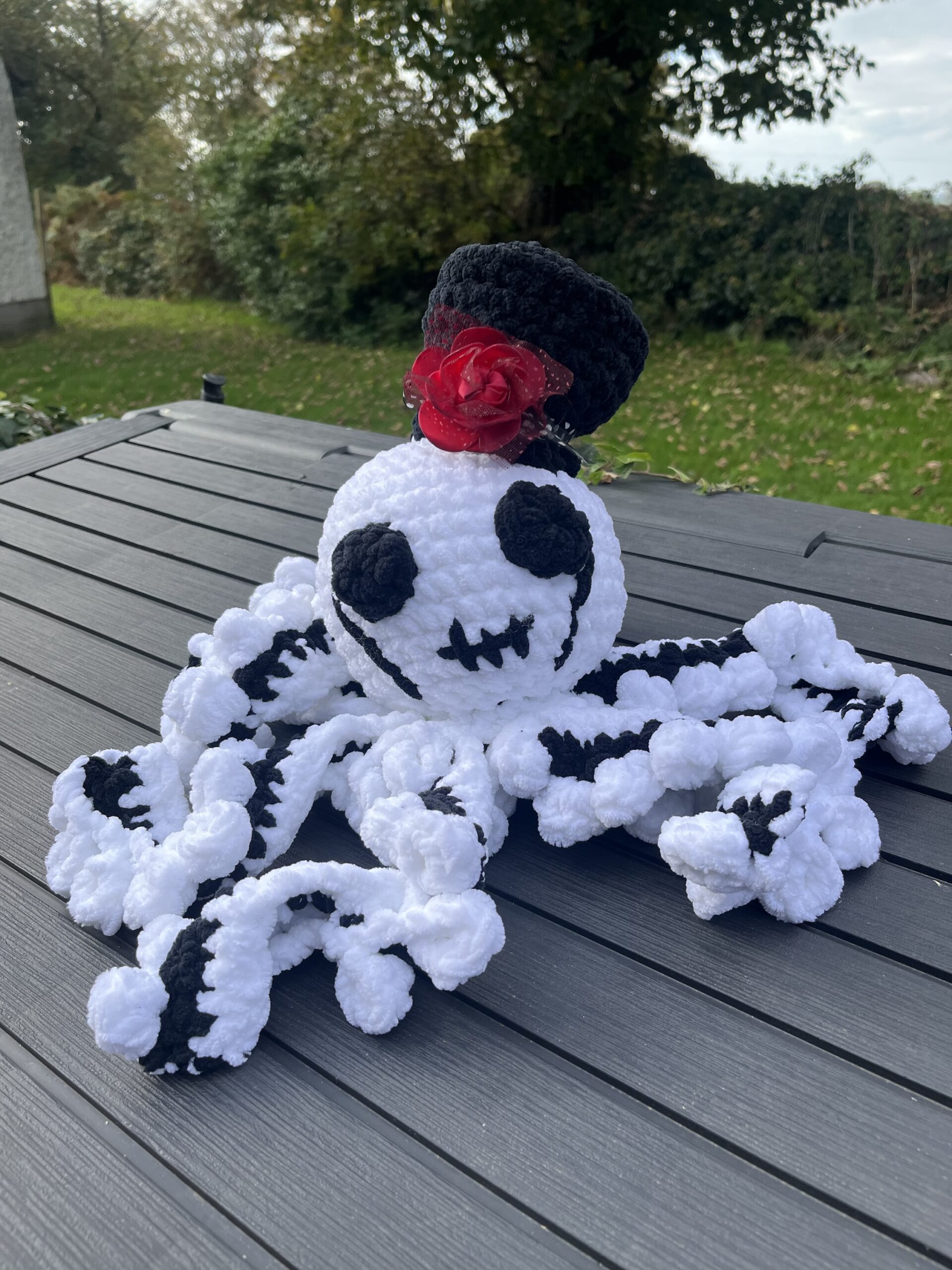 This Octopus is in Black and white blanket yarn this Octopus has a black top hat with rose and ribbon attached. Can be made to order in your own colour choice .